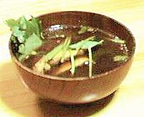 これは、さしみにしたつばすのあらで作った赤出汁(あかだし)。三つ葉を添えてある。さしみに、赤出汁。これにお酒が少々と白いご飯があれば、それが幸福というものだ。